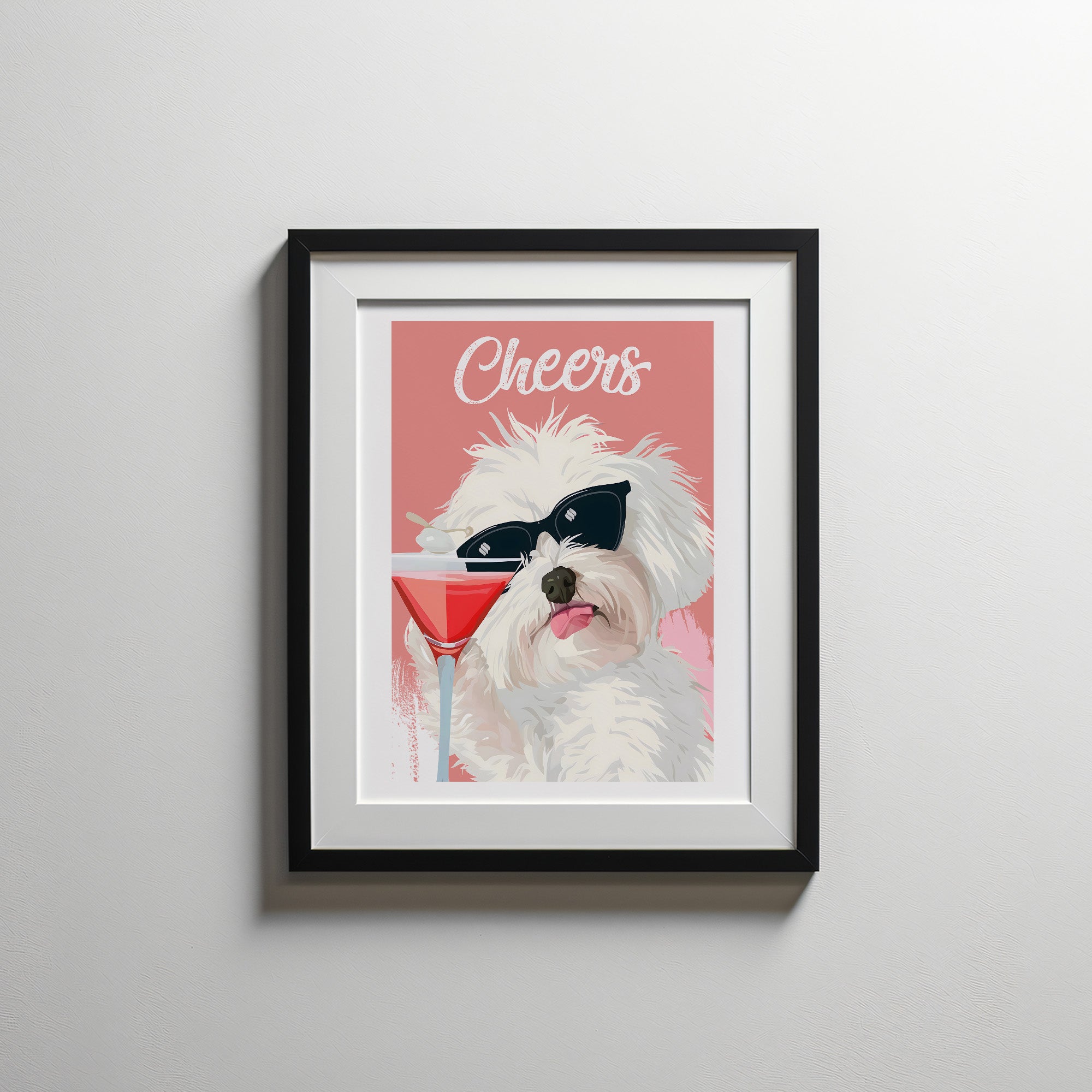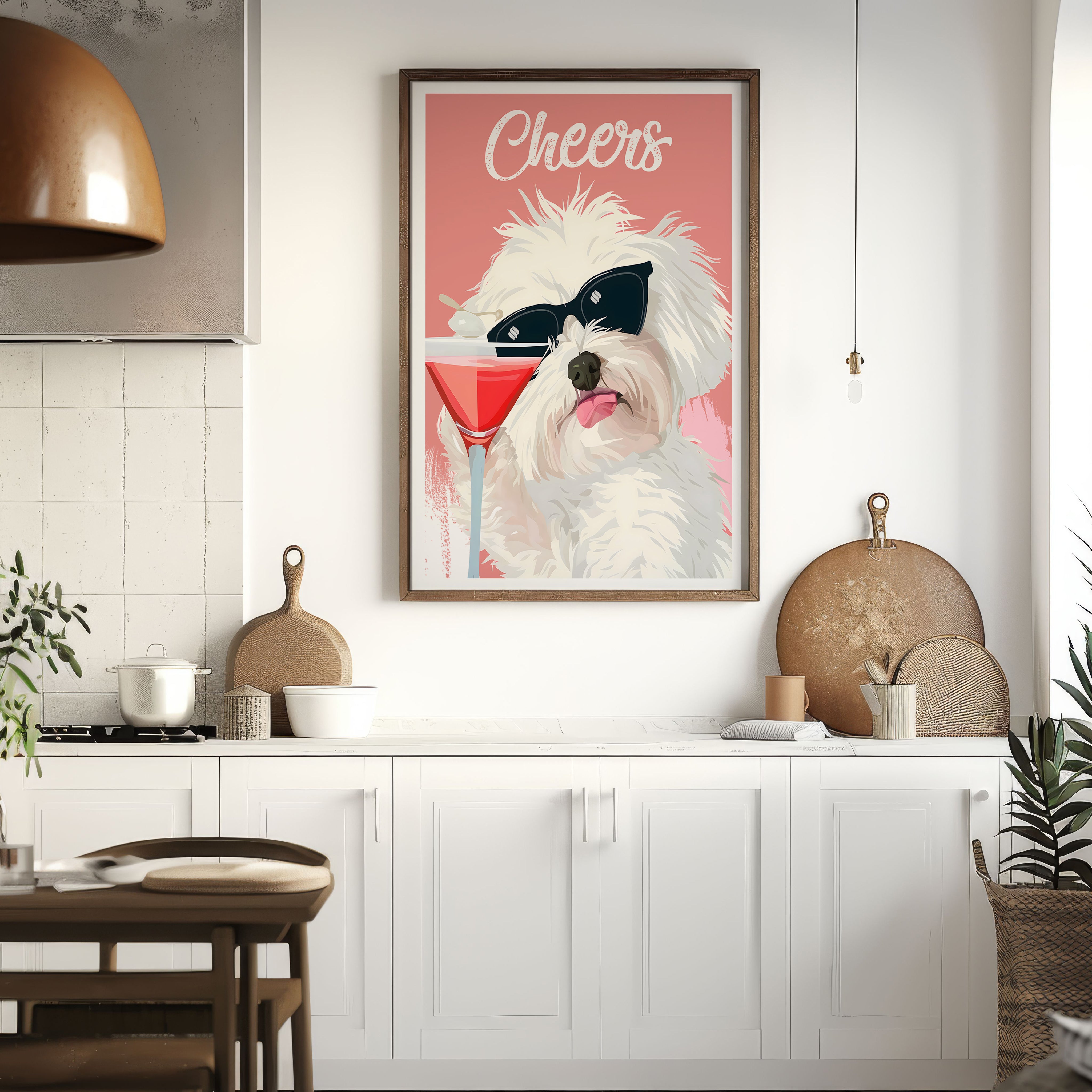 Cheers! Bring some playful charm to your walls with this whimsical "Cheers" art print! Featuring a fluffy white dog in chic sunglasses, sipping on a martini against a soft pink background. This art piece adds a light-hearted and playful touch to any room. Perfect for a bar space, kitchen, or lounge area, this high-quality art print combines humour and style, making it an excellent gift for dog and cocktail lovers.