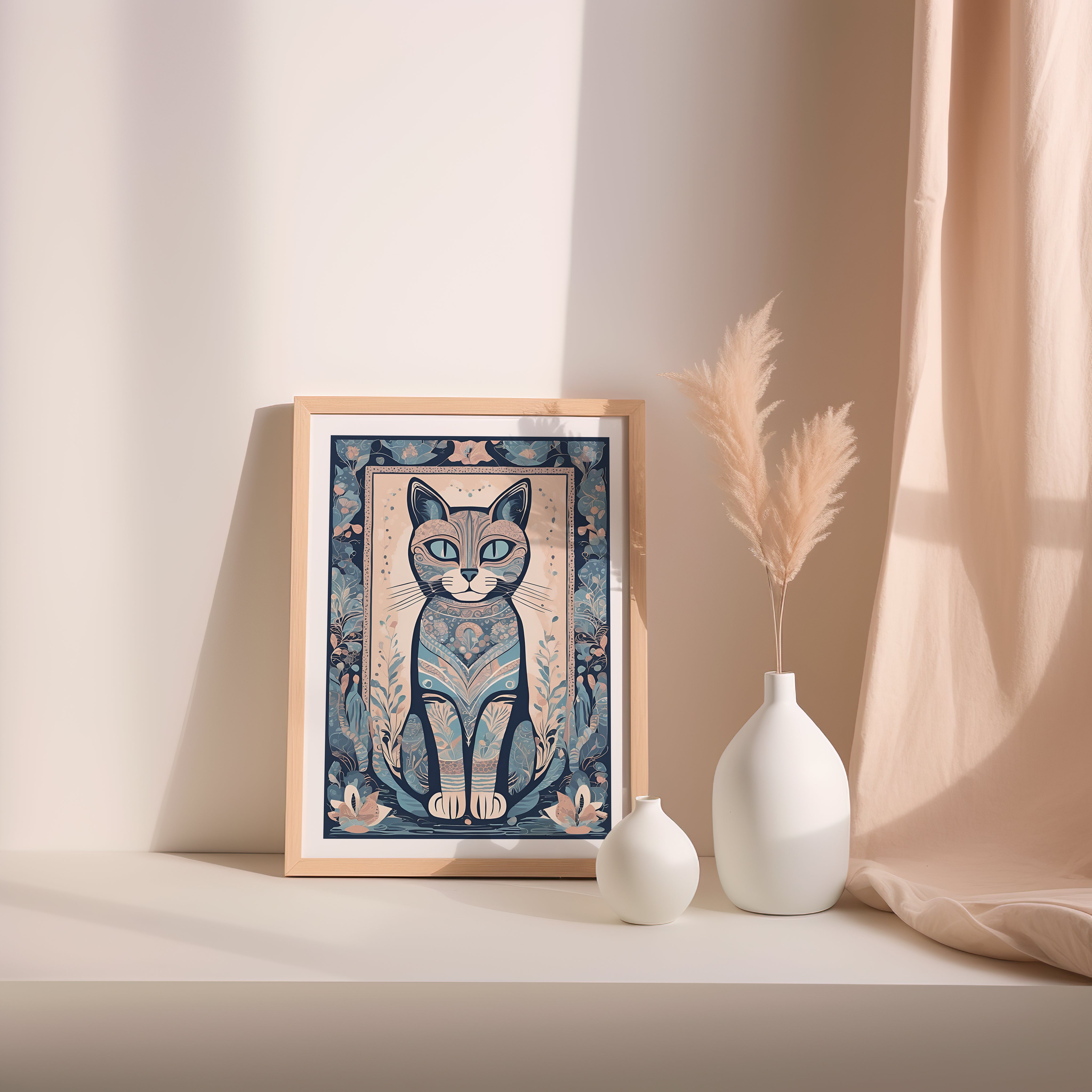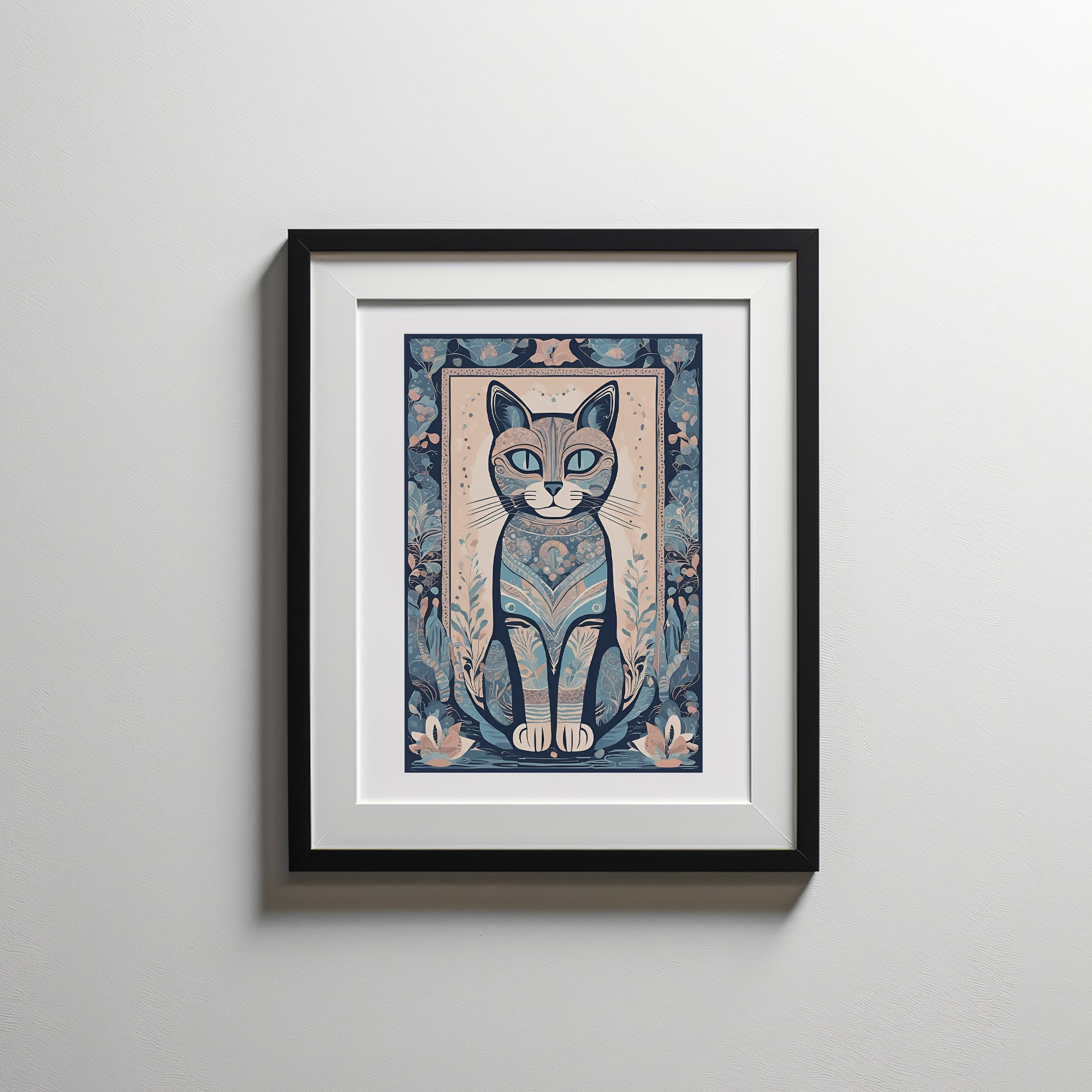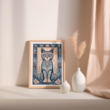 Whiskers & Wonder - Blue Cat No: 1. This cat-themed wall art brings a touch of whimsy to any space. With intricate detailing and a harmonious colour palette, it beautifully captures the essence of feline grace amidst nature-inspired patterns. Perfect for cat lovers and art enthusiasts alike, this piece adds a playful yet sophisticated vibe to your home decor.