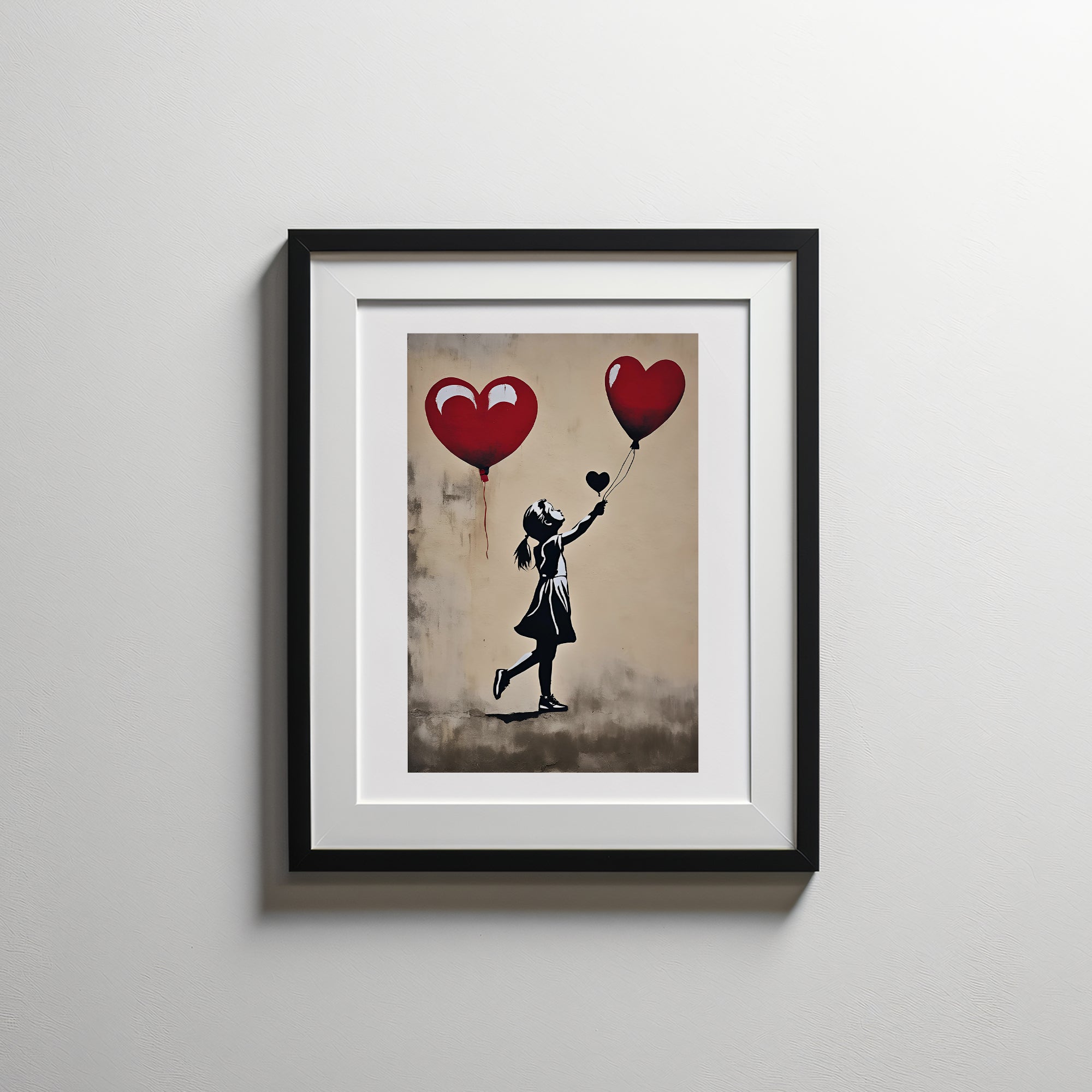 This evocative artwork captures a young girl reaching up toward heart-shaped balloons, symbolizing innocence, dreams, and the power of hope. The bold contrast between her silhouette and the vibrant red balloons draws the viewer’s eye, emphasizing the delicate moment of letting go. The heart-shaped balloons may signify love, freedom, or cherished aspirations, floating just beyond reach yet forever inspiring. With a minimalistic colour palette and impactful imagery, this piece resonates with universal themes of longing and resilience, making it a poignant addition to any space.