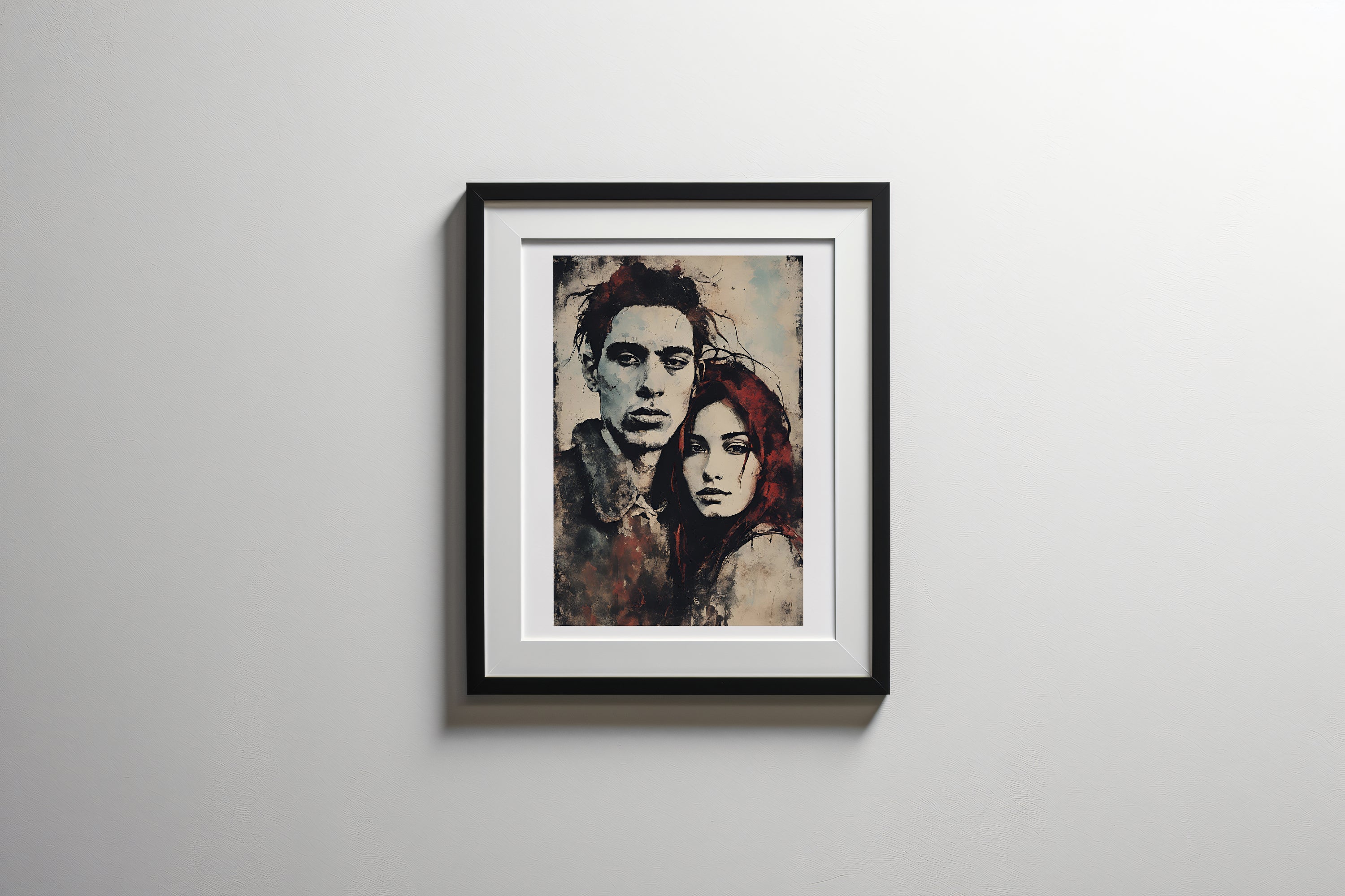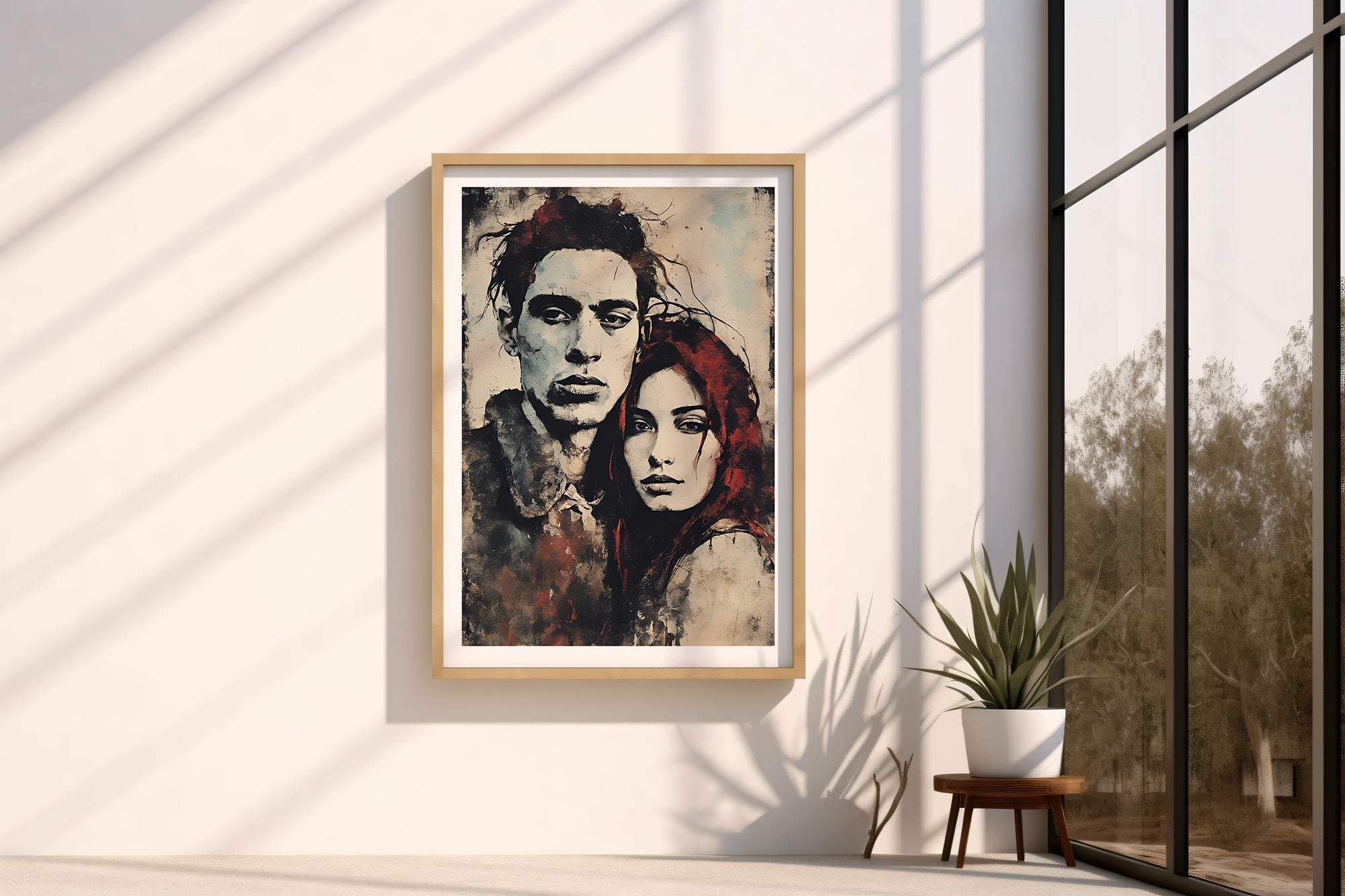"Eternal Bond" is a powerful mixed-media portrait that explores the intensity of connection and resilience. The artwork features a striking depiction of a couple, their expressions raw and evocative, set against a textured, grunge-like background. The muted palette, interspersed with bold strokes of deep red, symbolizes passion, struggle, and unwavering unity. Their piercing gazes invite viewers to delve into the complexities of human relationships, where love and vulnerability coexist. This piece resonates with themes of loyalty, individuality, and the beauty of imperfection, making it a profound addition to any modern art collection.