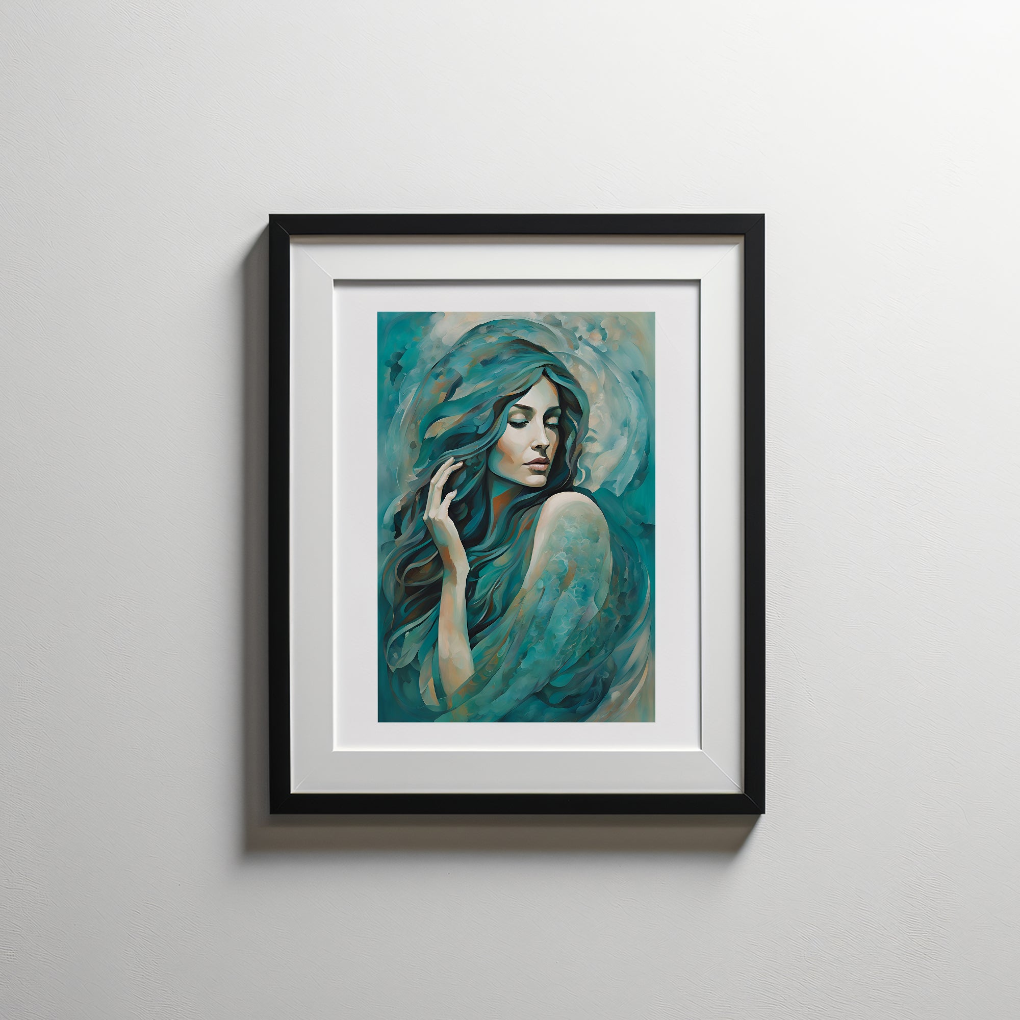 "Embrace of the Sea" captures a woman enveloped in flowing shades of teal and aqua, as if she is one with the ocean’s gentle waves. Her serene expression and graceful posture evoke a sense of calm and introspection, while the swirling hues around her create a dreamlike ambiance, reminiscent of water’s depth and fluidity. This artwork brings together elements of nature and mystique, making it an ideal addition to spaces that celebrate tranquility, self-reflection, and the soothing essence of the sea. Perfect for those who find solace in water’s beauty, this piece invites viewers to be carried away by its peaceful rhythm.