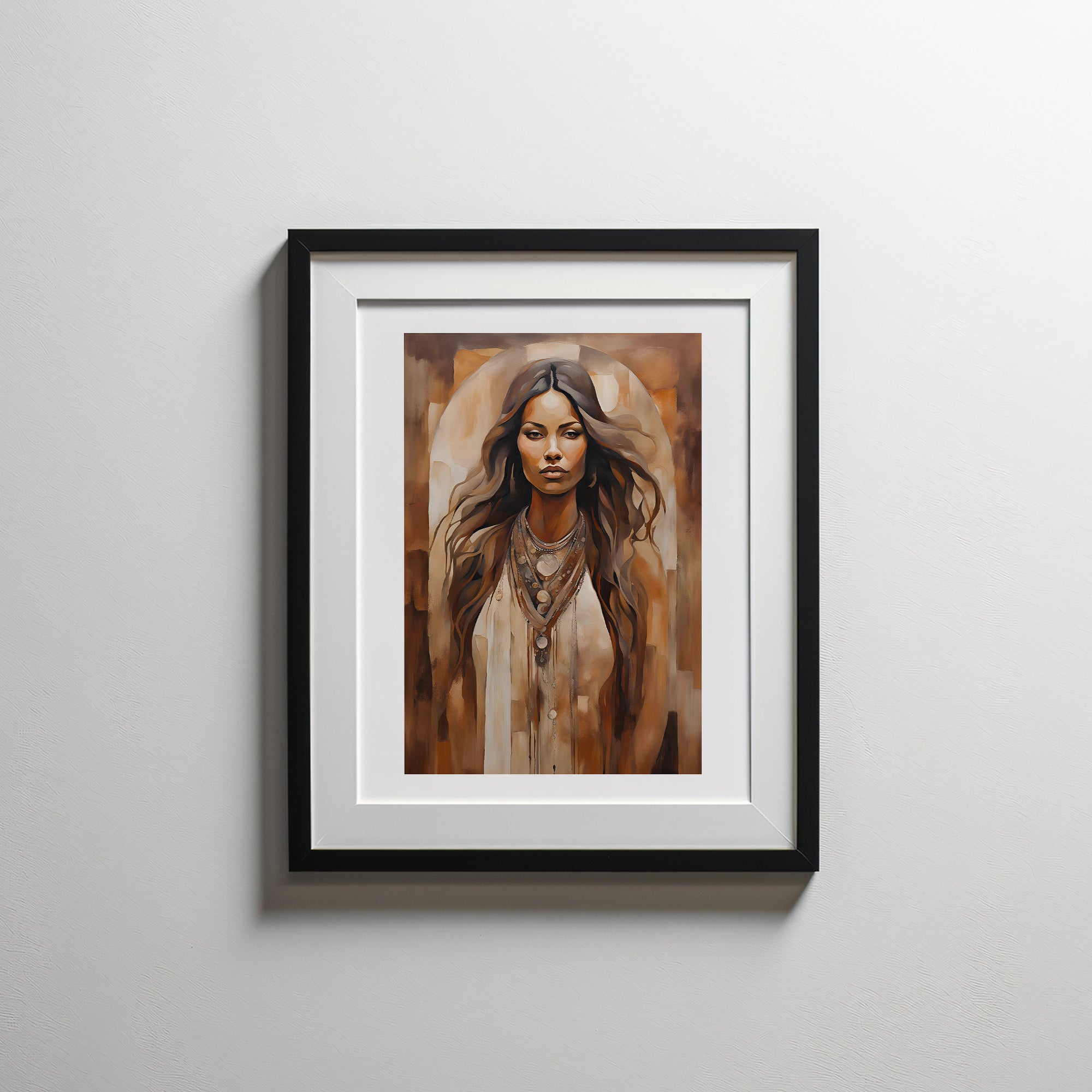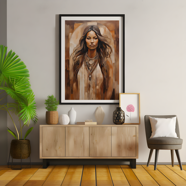 "Elegant Grace" portrays a figure of quiet strength and elegance, draped in earthy tones that echo the warm hues of sand and sun-baked landscapes. Her steady gaze and flowing hair, cascading like desert dunes, convey resilience and grounded wisdom. The soft halo effect behind her creates an aura of reverence, as if she embodies the spirit of the desert—timeless, enduring, and beautiful in its simplicity. Her layered necklaces and bohemian style evoke a deep connection to nature and heritage. This artwork invites viewers to find beauty in stillness and strength in the natural world’s quiet, enduring presence.