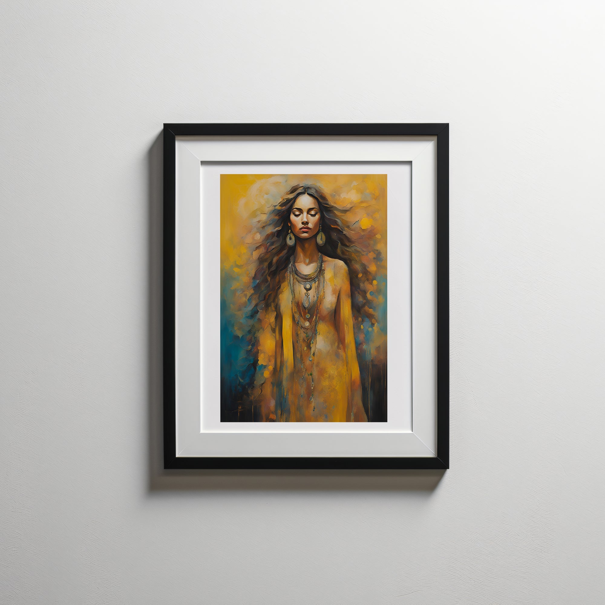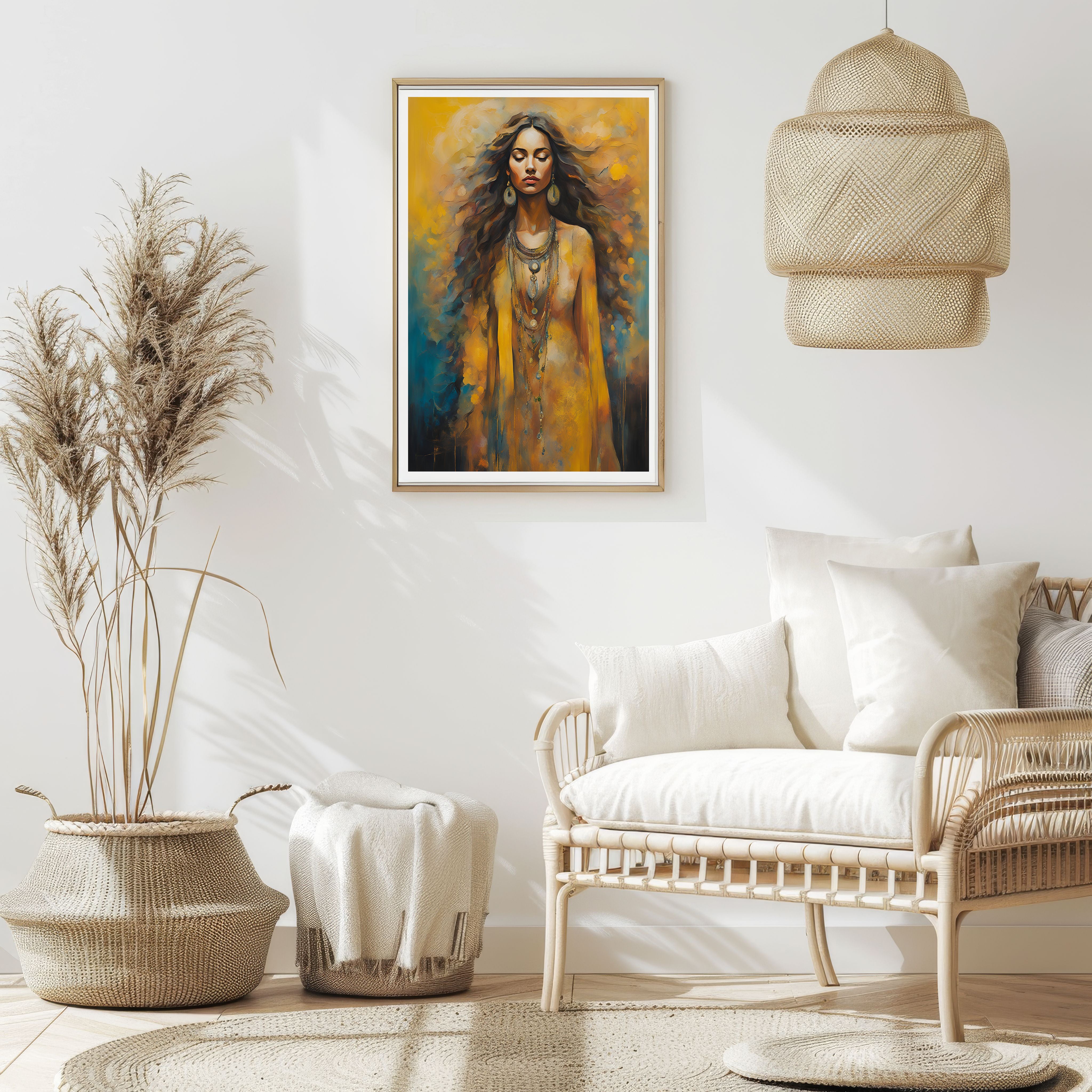 "Ember of Tranquility" portrays a woman enveloped in warm, golden hues with hints of deep blues and fiery orange, creating a stunning balance between warmth and serenity. Her flowing hair and closed eyes suggest a meditative state, as though she is connecting deeply with her inner self. The soft, abstract background seems to radiate from her, echoing the essence of peace, strength, and self-assurance. Her attire, adorned with intricate jewellery, adds an earthy elegance to her presence. This artwork is perfect for spaces that appreciate art with a sense of calm, spirituality, and the quiet power of feminine grace.