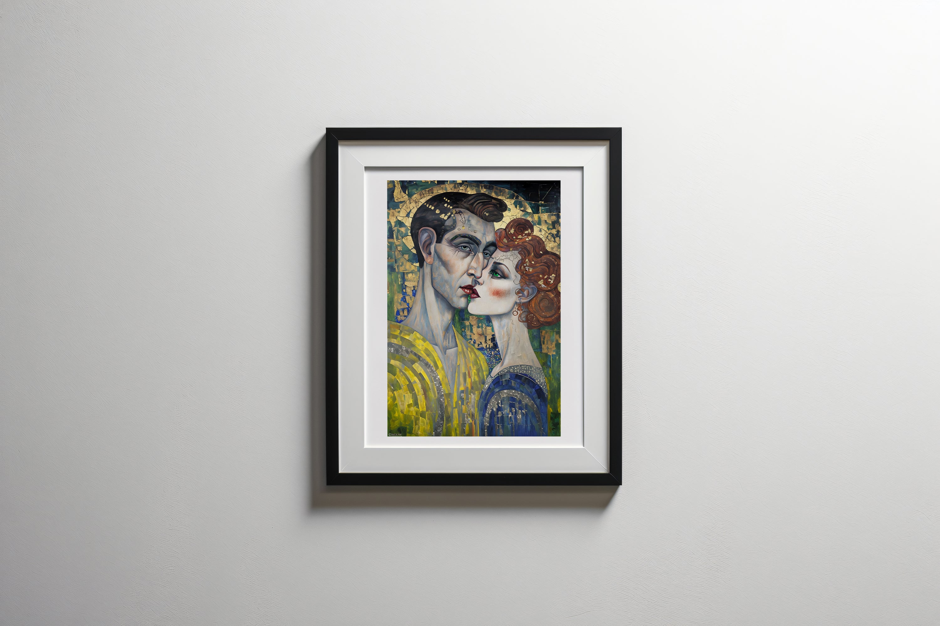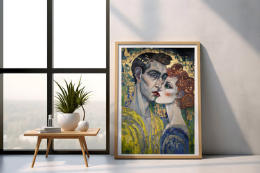 This evocative expressionist masterpiece captures the intimate moment of a couple sharing a gentle, passionate kiss. The stylized features and angular forms of the figures are enriched with radiant gold leaf accents, adding depth and luminosity to the scene. Their garments, woven with intricate textures and shimmering hues of yellow and blue, harmonize beautifully with the abstracted, gilded background. The composition exudes an air of vulnerability and connection, symbolizing the timeless language of love. This artwork is an ideal choice for those who value emotion, symbolism, and artistic sophistication in their decor.
