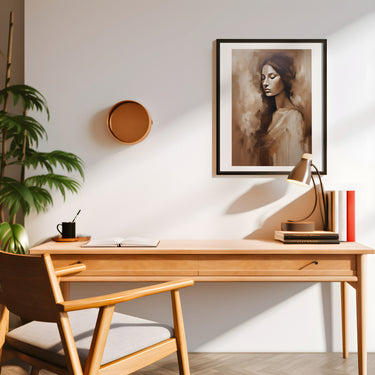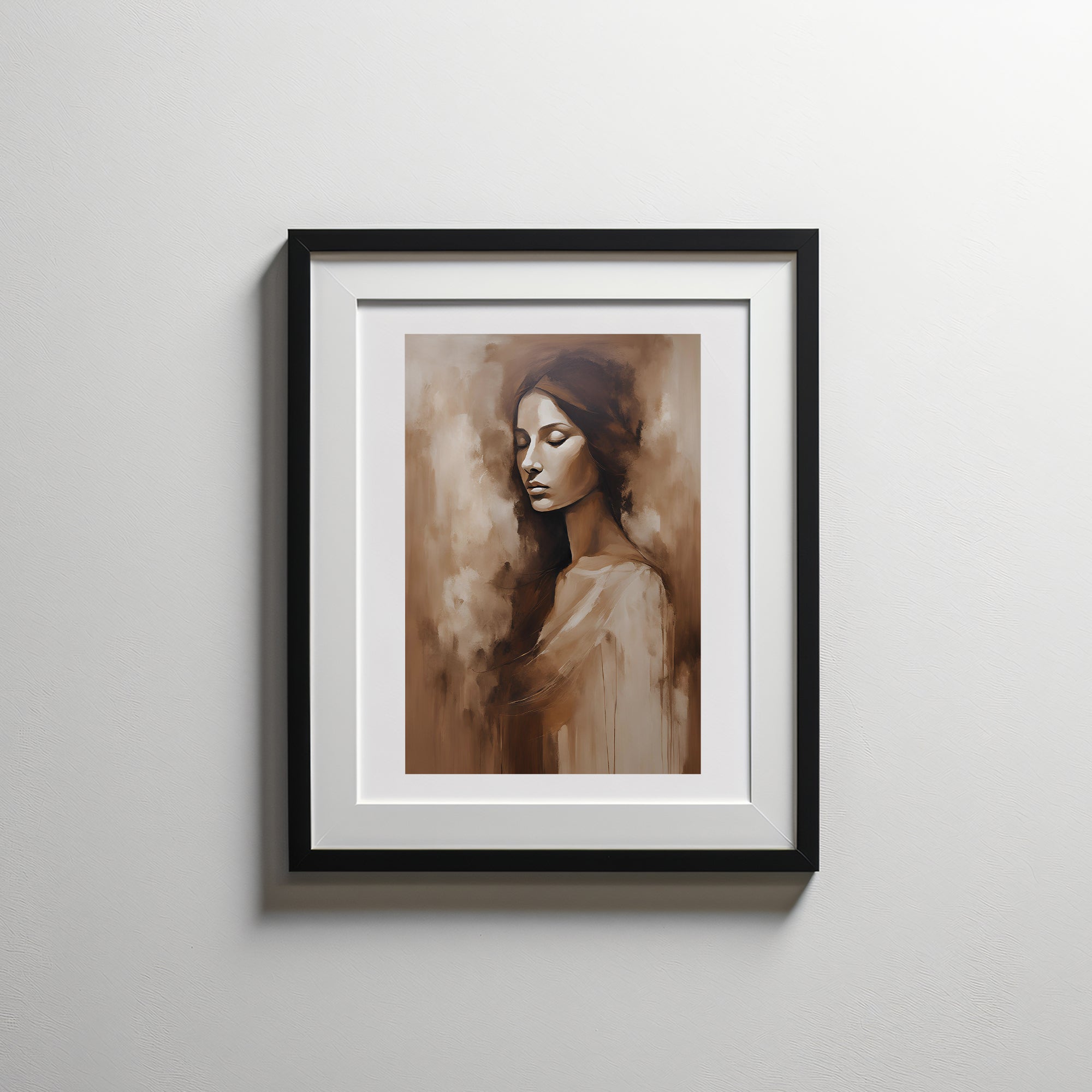 This elegant portrait captures the quiet strength and poise of a woman in a soft, muted palette of earthy browns and beiges. Her closed eyes and gentle expression convey a moment of introspection and calm, as if lost in a peaceful reverie. The delicate brushstrokes and soft blending create a dreamlike aura, enhancing the painting's sense of intimacy and tranquility. Perfect for spaces that seek to inspire relaxation and mindfulness, this piece embodies the beauty of simplicity and the power of stillness, inviting viewers into a serene escape from the everyday.