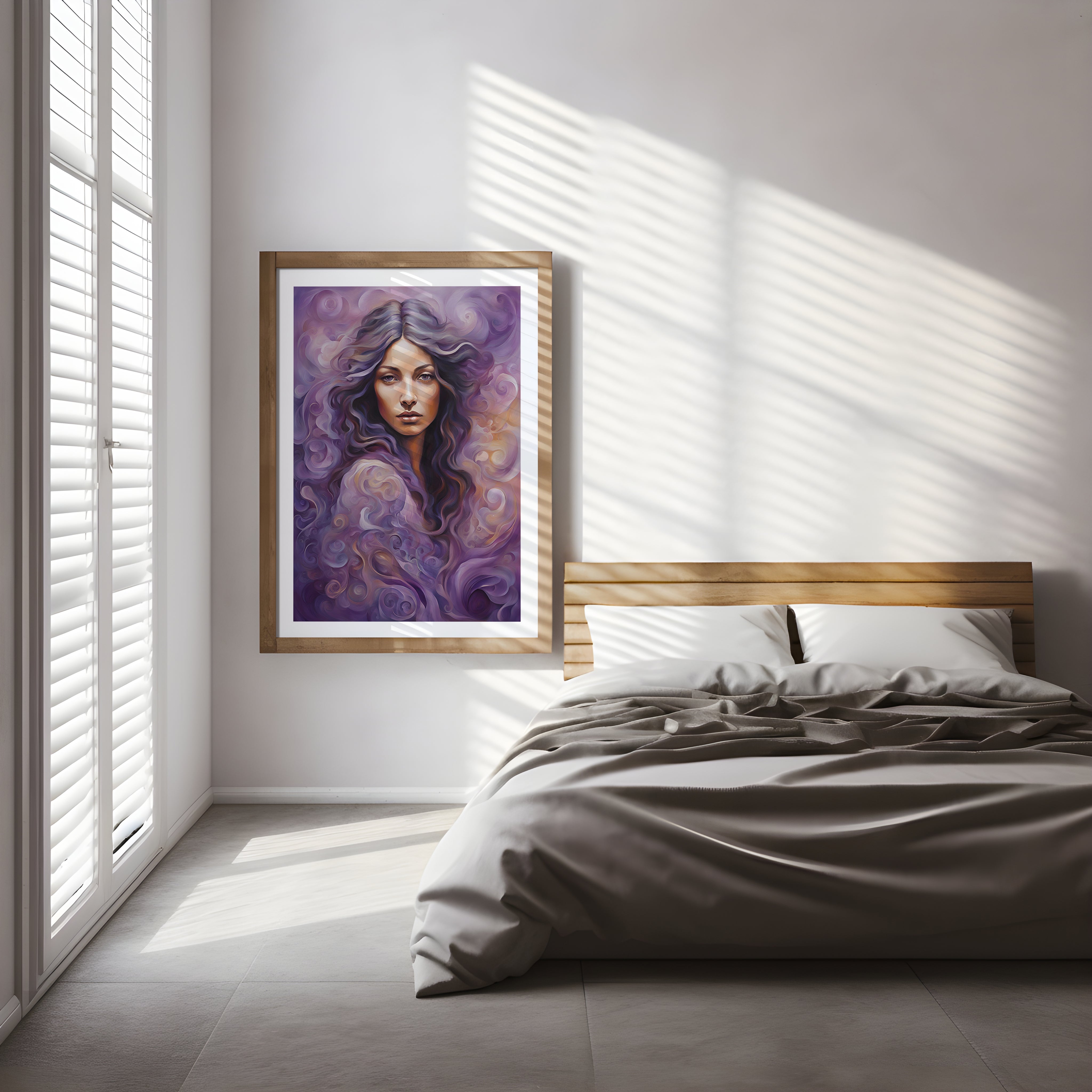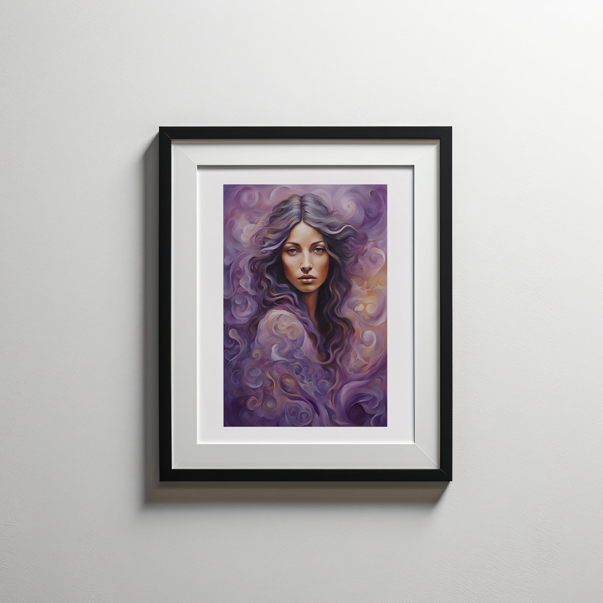 In "Whispers in the Ether," a woman’s face emerges from a swirling tapestry of purples, lavenders, and hints of soft gold, creating an ethereal blend of beauty and mystery. Her calm, introspective gaze draws the viewer in, while the flowing, abstract shapes around her suggest an otherworldly energy, as if she is surrounded by the whispers of a dream. The intricate patterns and rich hues create a sense of depth and movement, bringing a mystical, almost cosmic feel to the piece. Perfect for spaces that embrace imagination and introspection, this artwork invites viewers to enter a realm of tranquility and wonder, where reality and dreams intertwine.