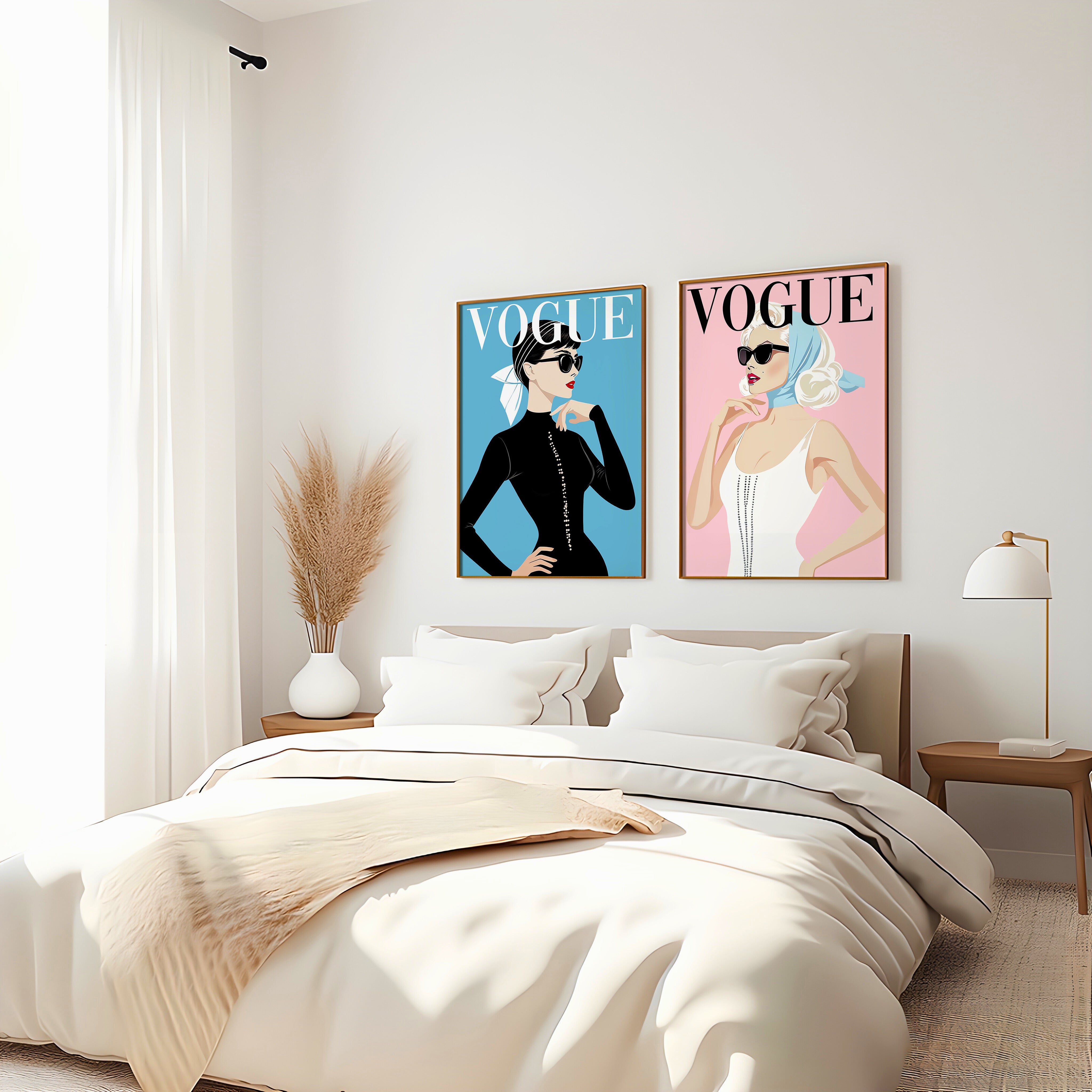 The "Vintage Vogue Elegance Series" brings the timeless allure of classic Hollywood glamour and fashion to life through minimalist, high-contrast illustrations. Each piece exudes sophistication, featuring elegantly styled women adorned with bold accessories and chic headscarves, capturing the essence of iconic beauty and style. Set against pastel backgrounds, this collection draws inspiration from vintage magazine covers, making it a stunning choice for fashion aficionados and art lovers alike. Perfect for adding a touch of retro elegance to modern spaces, these artworks celebrate the enduring appeal of vintage sophistication.