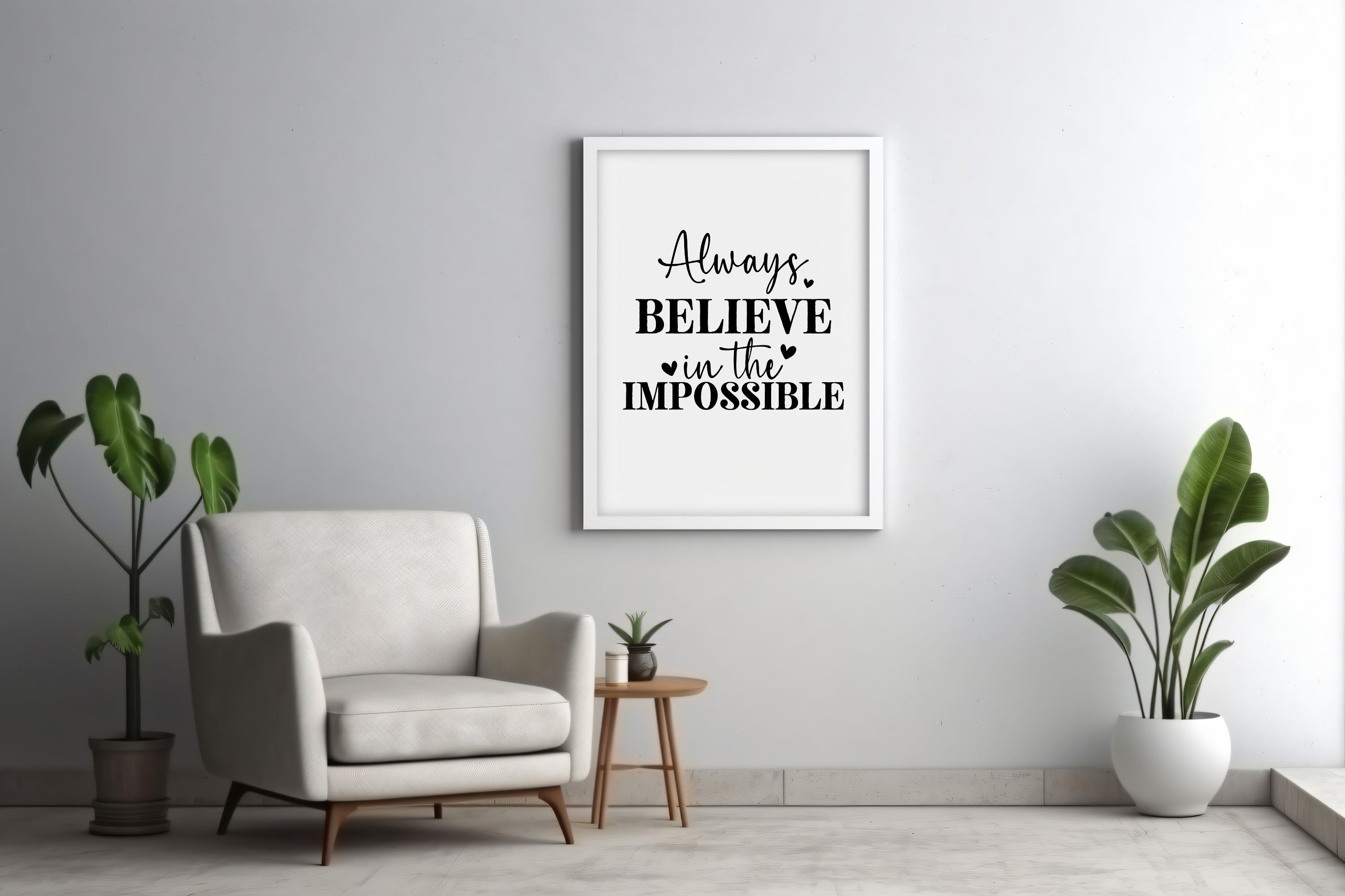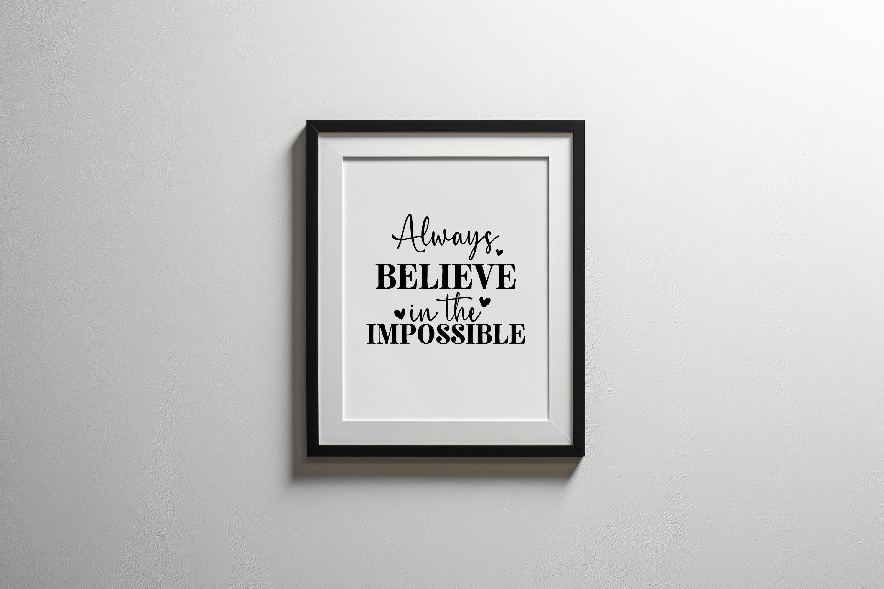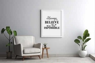 This inspiring typographic art piece delivers a powerful motivational message: "Always Believe in the Impossible." Featuring a stylish mix of elegant script and bold block lettering, the design is adorned with charming heart accents that add a touch of warmth and positivity. Perfect for uplifting any space, this artwork is ideal for home offices, living rooms, or gift-giving occasions to spread hope and encouragement. A reminder to dream big and embrace endless possibilities.