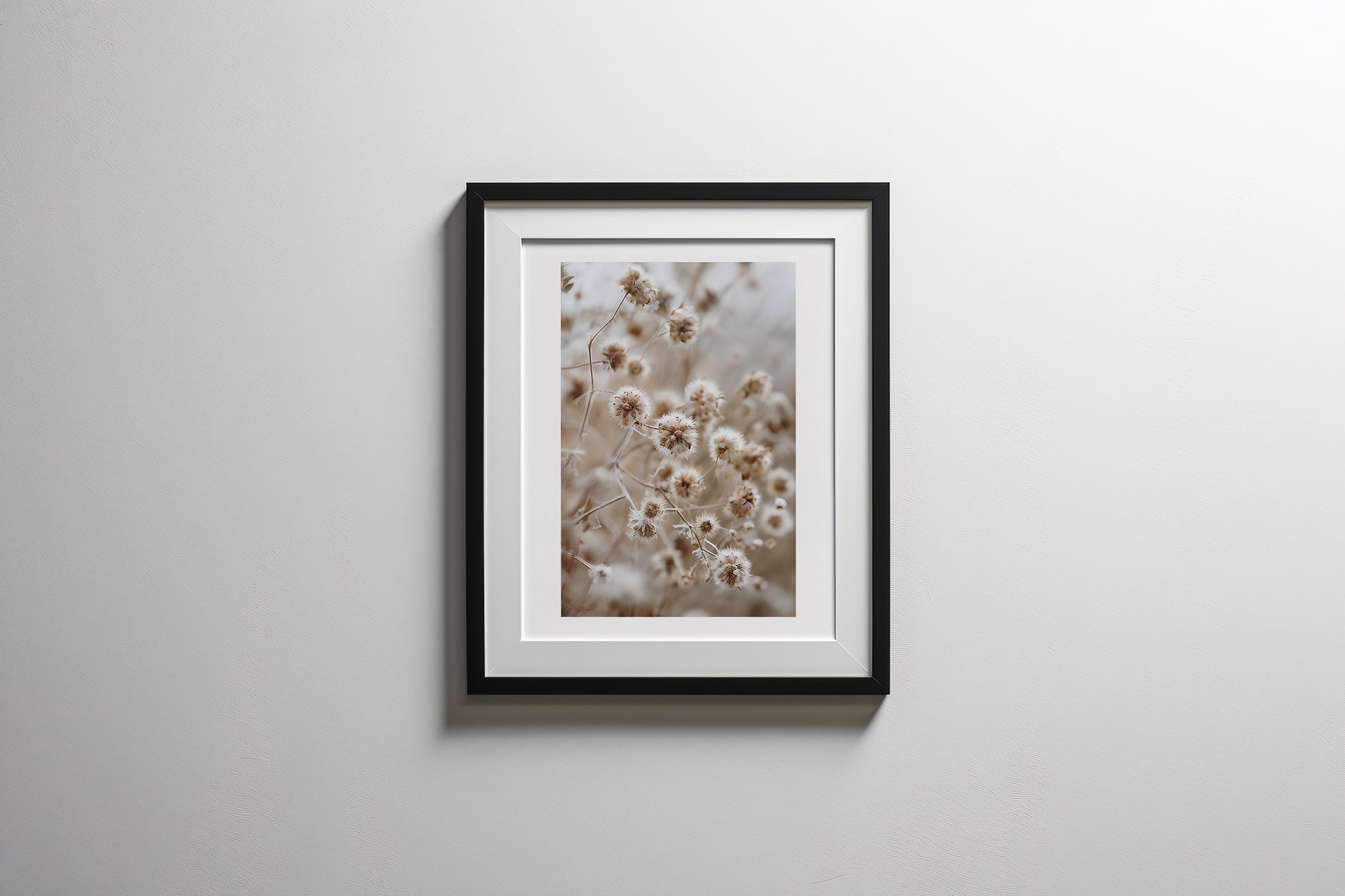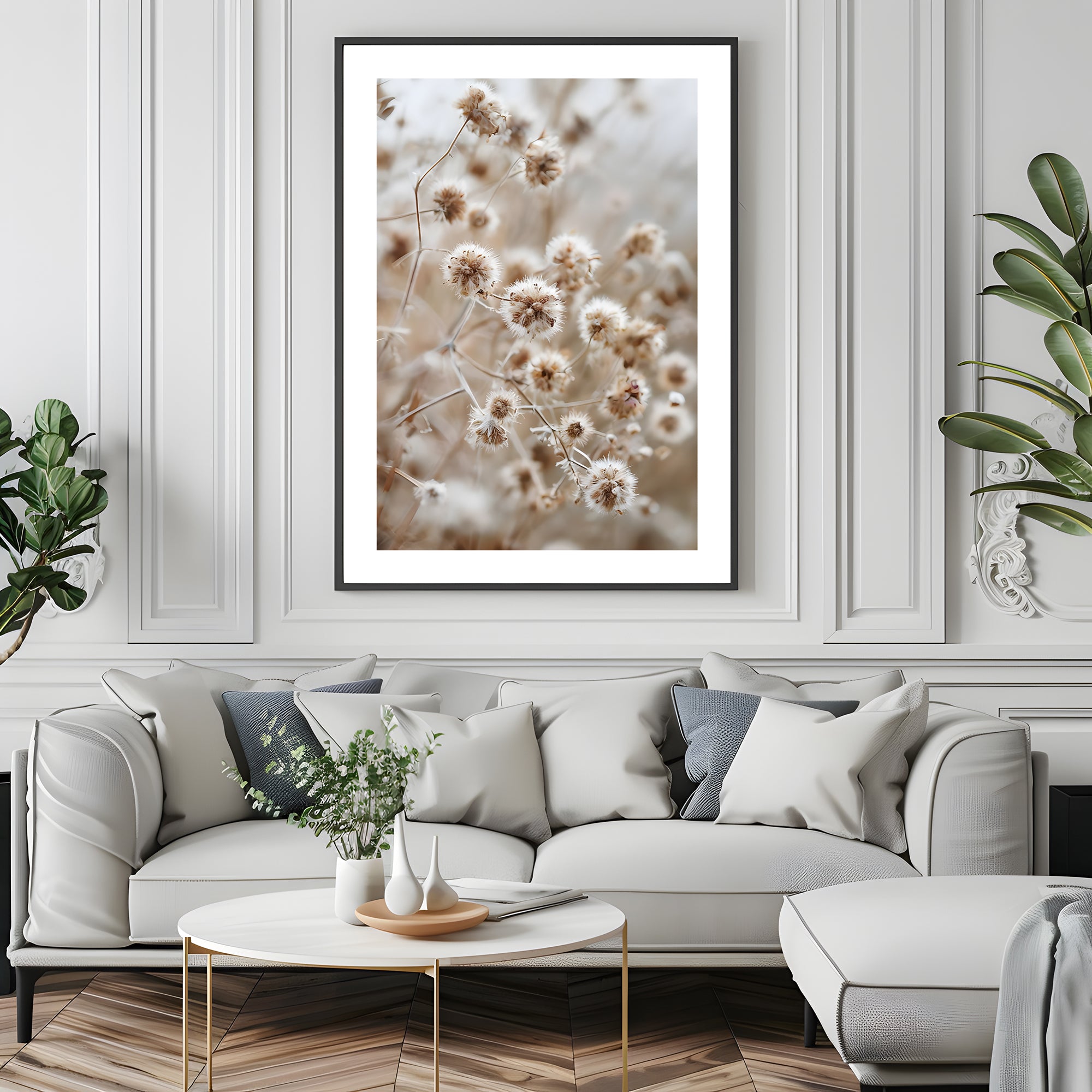 This enchanting photograph features delicate dried flower clusters, their feathery textures softly illuminated by a gentle light. The muted tones and subtle details evoke a sense of warmth and nostalgia, celebrating the quiet beauty of nature's life cycles. Perfect for creating a tranquil and organic aesthetic, this artwork adds a touch of rustic elegance to any interior space.